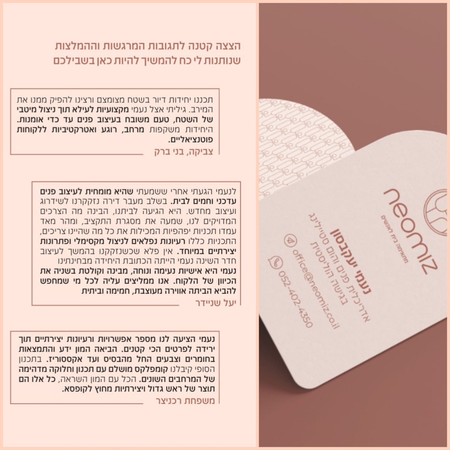 נשמח להקשיב, לייעץ ולהכווין אתכם בתהליך עיצוב נעים, מקצועי ומותאם אישית.